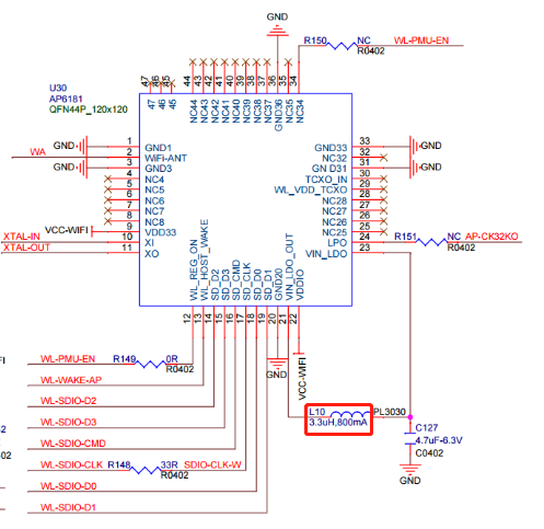 雖然這款貼片功率電感并沒有印字,但是,所使用的wifi模塊為AP6181,根據(jù)模塊配套電路,我們能夠了解到,這款wifi模塊電路中配套的貼片功率電感器參數(shù)為:3.3uH,800mA