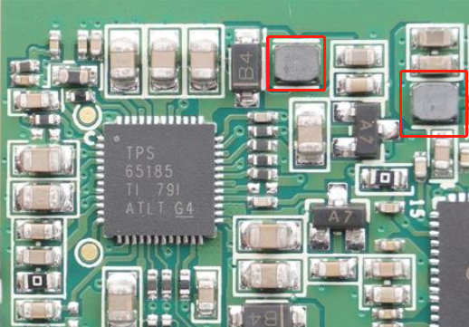 其次, 我們將視線轉(zhuǎn)移到閱讀器電路中,專門為E ink屏幕顯示設(shè)計(jì)的IC芯片,TI TPS65185,在這塊芯片的附近,我們也同樣能夠看見兩款沒有印字的貼片功率電感器。